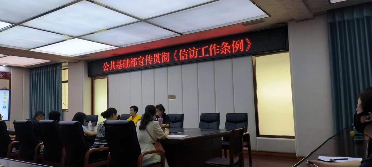 2023年5月19日中午12点40时,在南区综合楼三楼第四会议室,公共基础部召开2023年春季学期第四次工作会议暨宣传贯彻《信访工作条例》会议,公共基础部专兼职教师共计50余人参加此次会议,会议由薛鳗部长主持。
