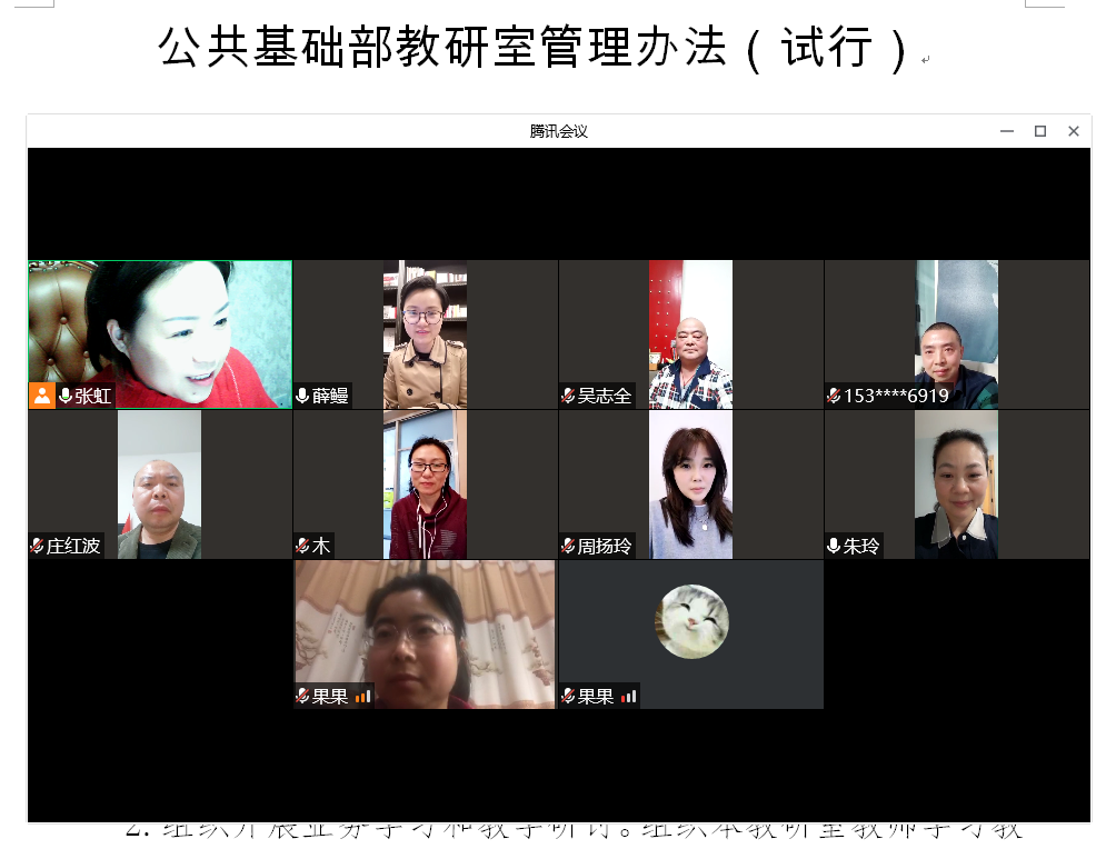 2022年3月12日晚,公共基础部通过腾讯会议(线上)召开2022年第一次教研室主任会议。公共基础部薛鳗部长、张虹副处长、各教研室主任、姚鹏老师参加此次会议。