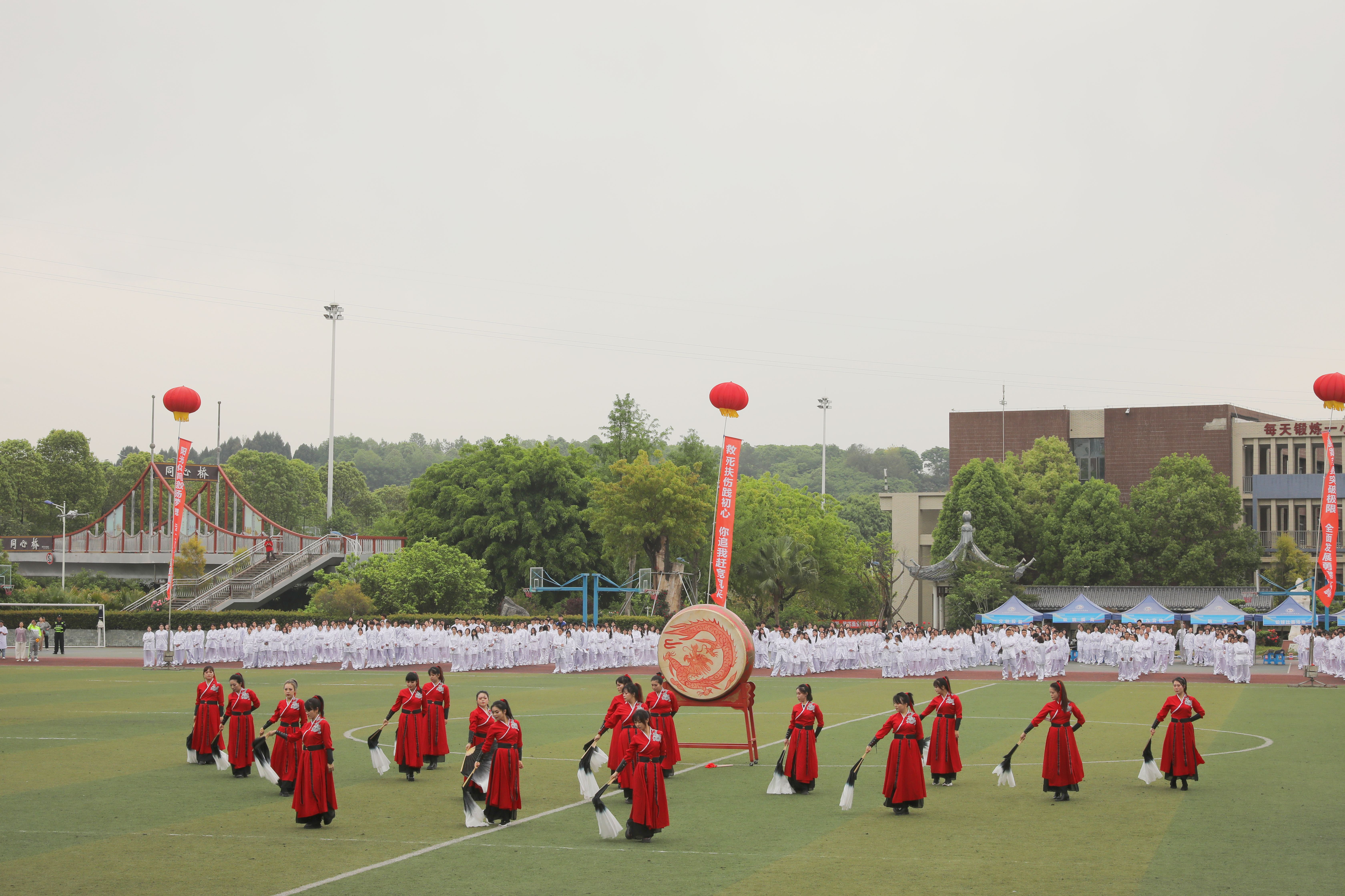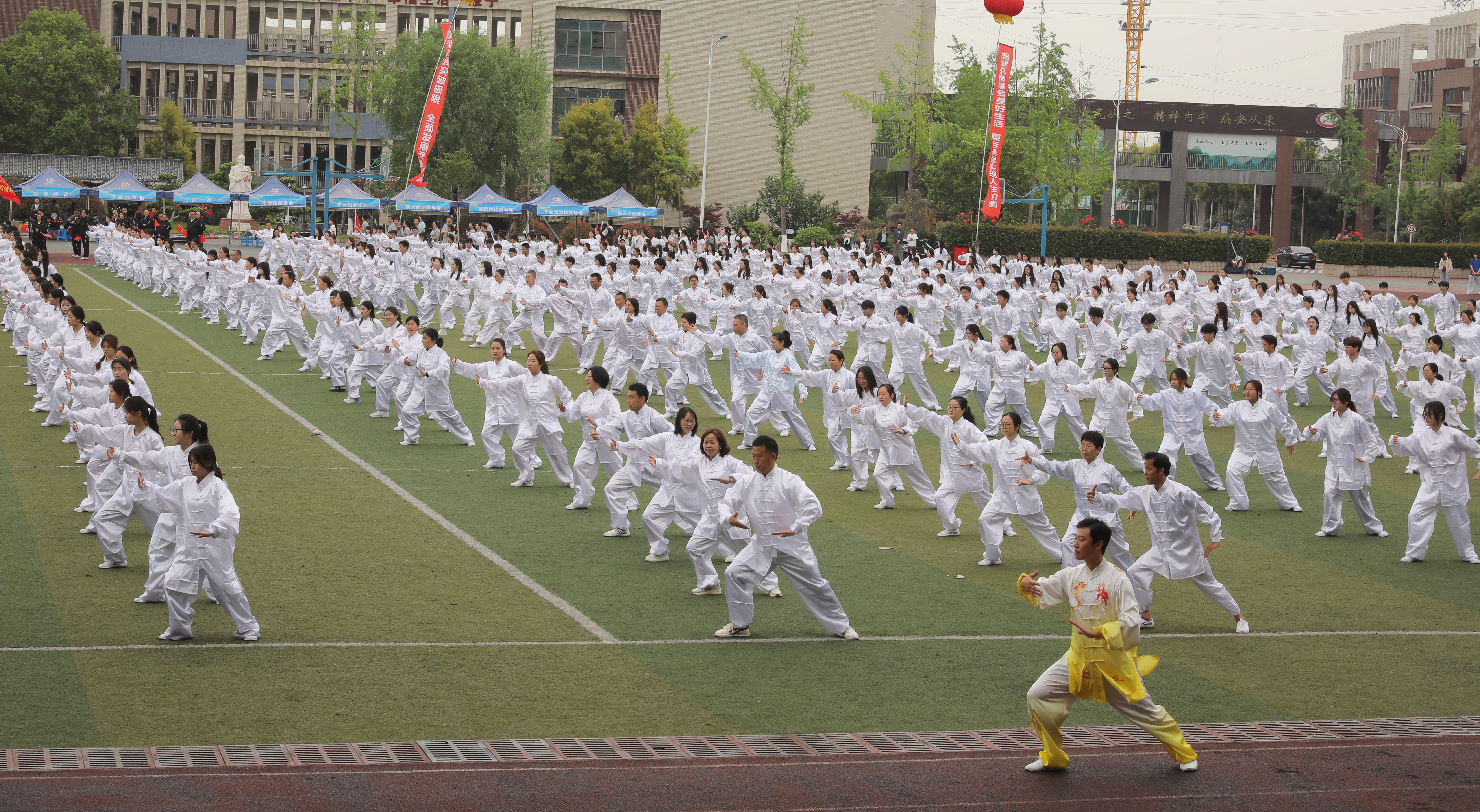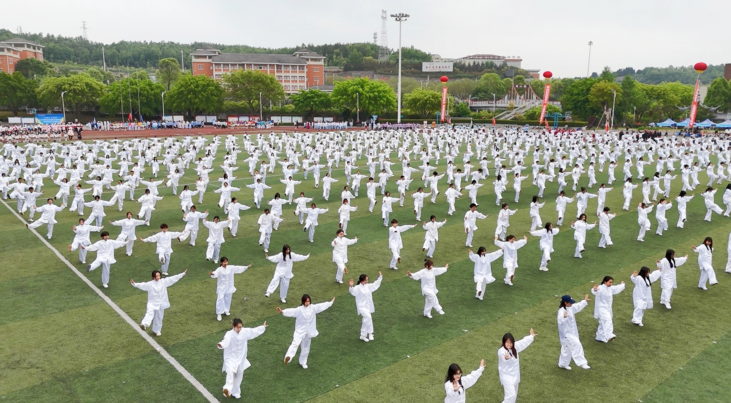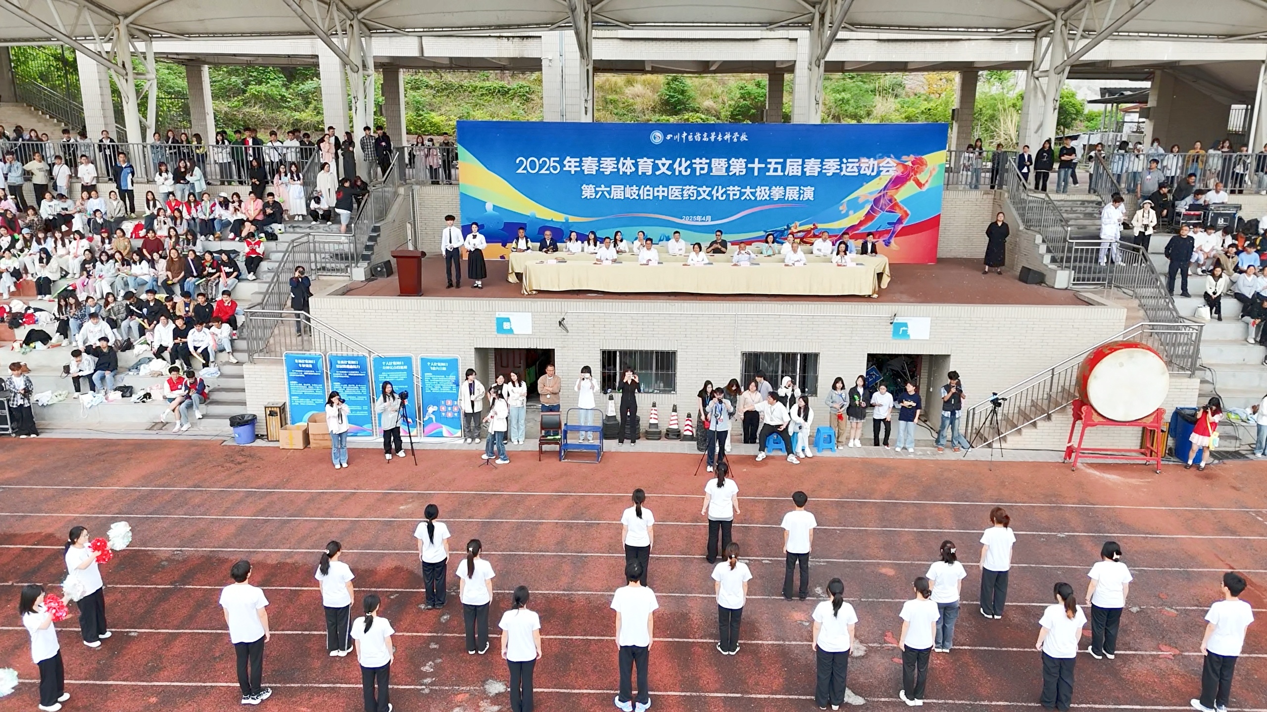 校党委书记李炜弘宣布2025年春季体育文化节暨第十五届春季运动会开幕。千名师生太极拳展演正式亮相,参演师生身着白色传统练功服,以舒展的身姿演绎“白鹤亮翅”“野马分鬃”等经典招式,动作刚柔并济,生动诠释太极拳"天人合一"的哲学理念,展现中医药文化与体育精神的深度融合。