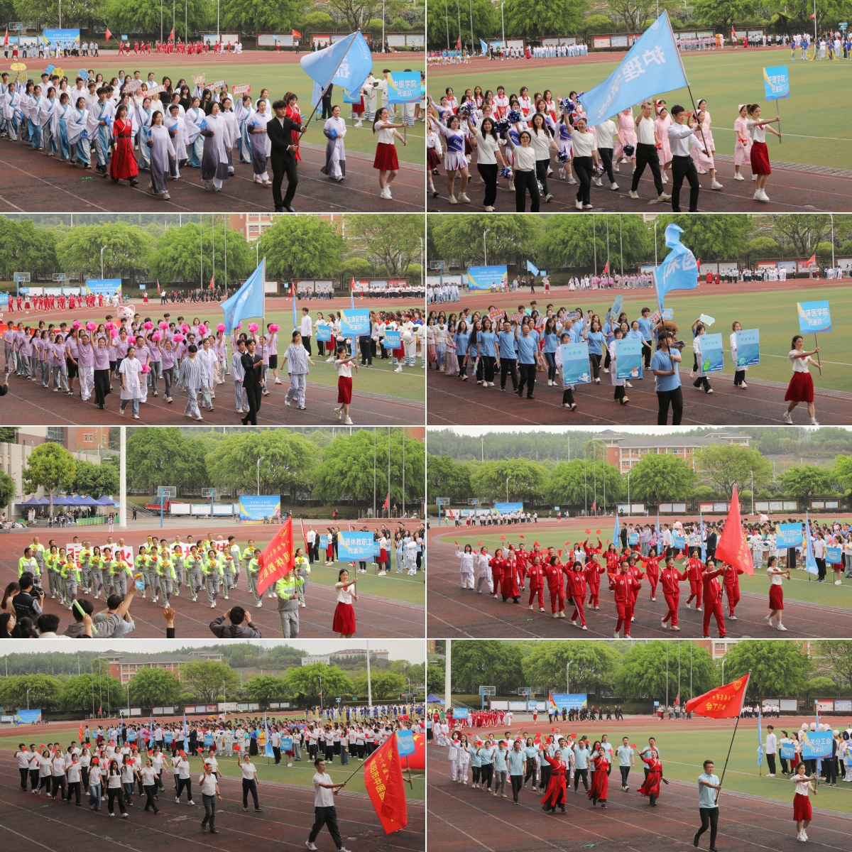 现场退休教职工代表队与师生方阵依次入场,通过《本草纲目》、康复操等专业元素的创意表演,用嘹亮的口号、欢快的步伐、健美的身姿彰显我校“团结奋斗 追求卓越”的精神风貌。