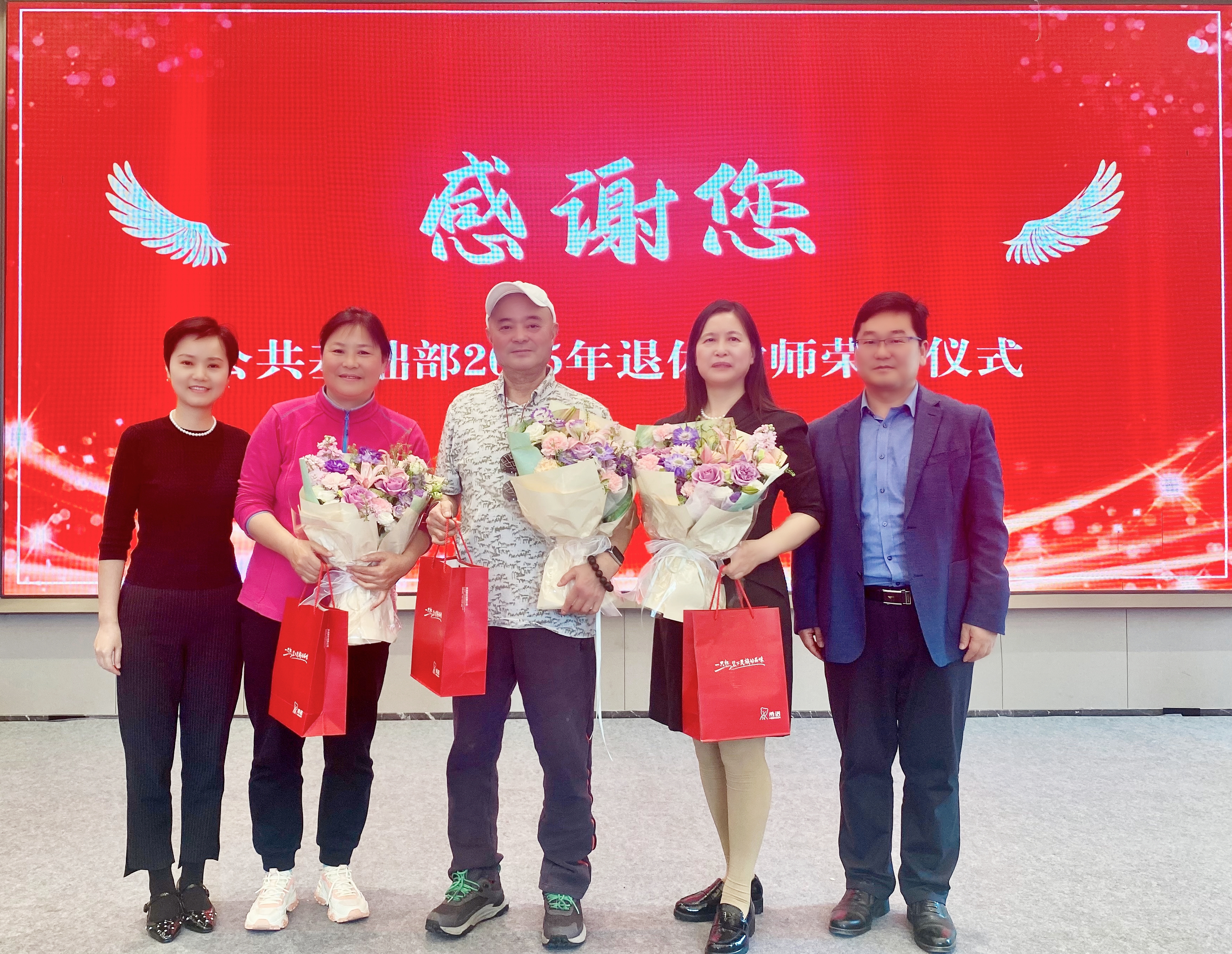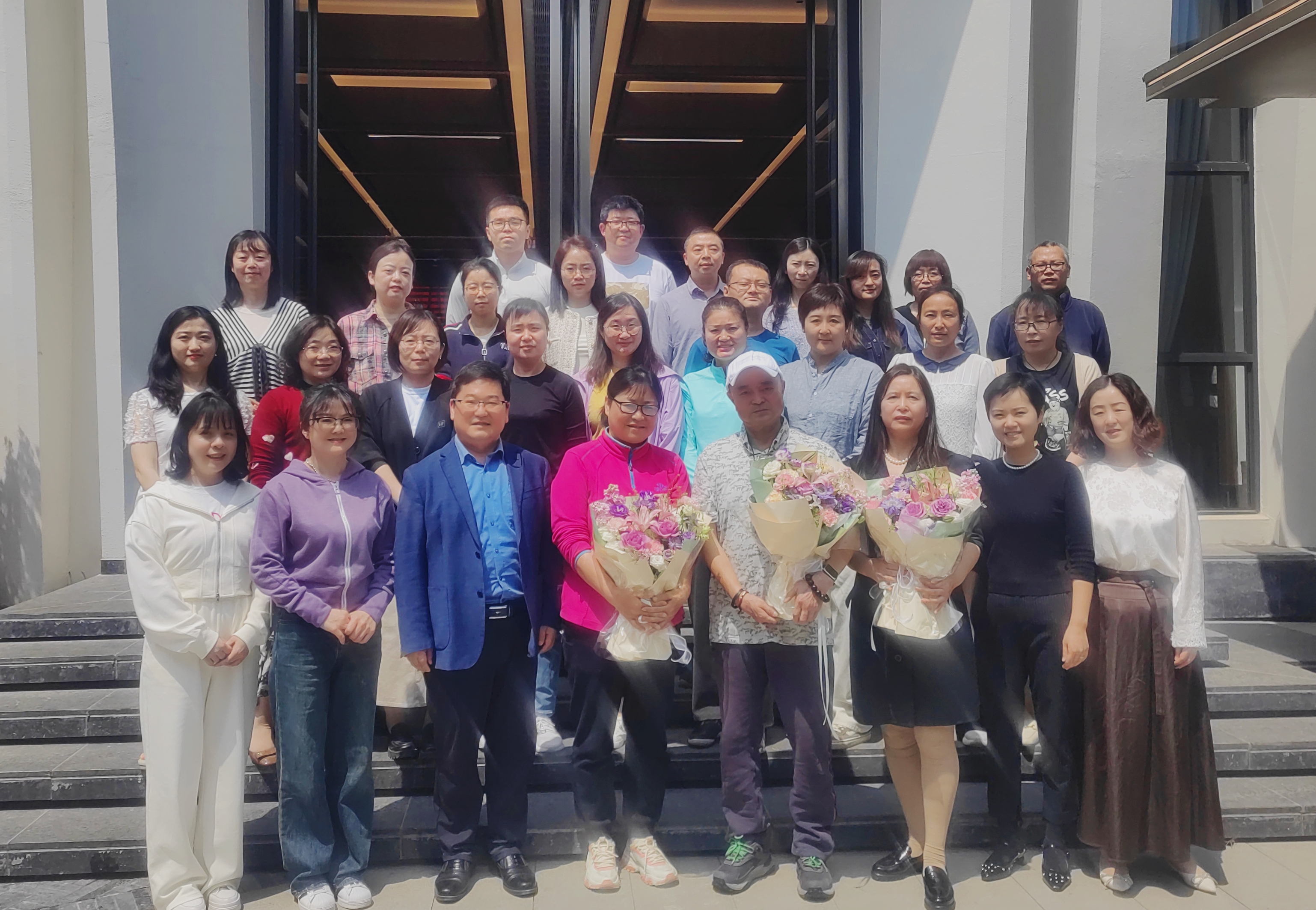 最后,副校长梁晓峰和老师们共同为三位教师送上鲜花和衷心的祝福“一愿岁月静好,二愿情怀永驻,三愿安康常伴”。