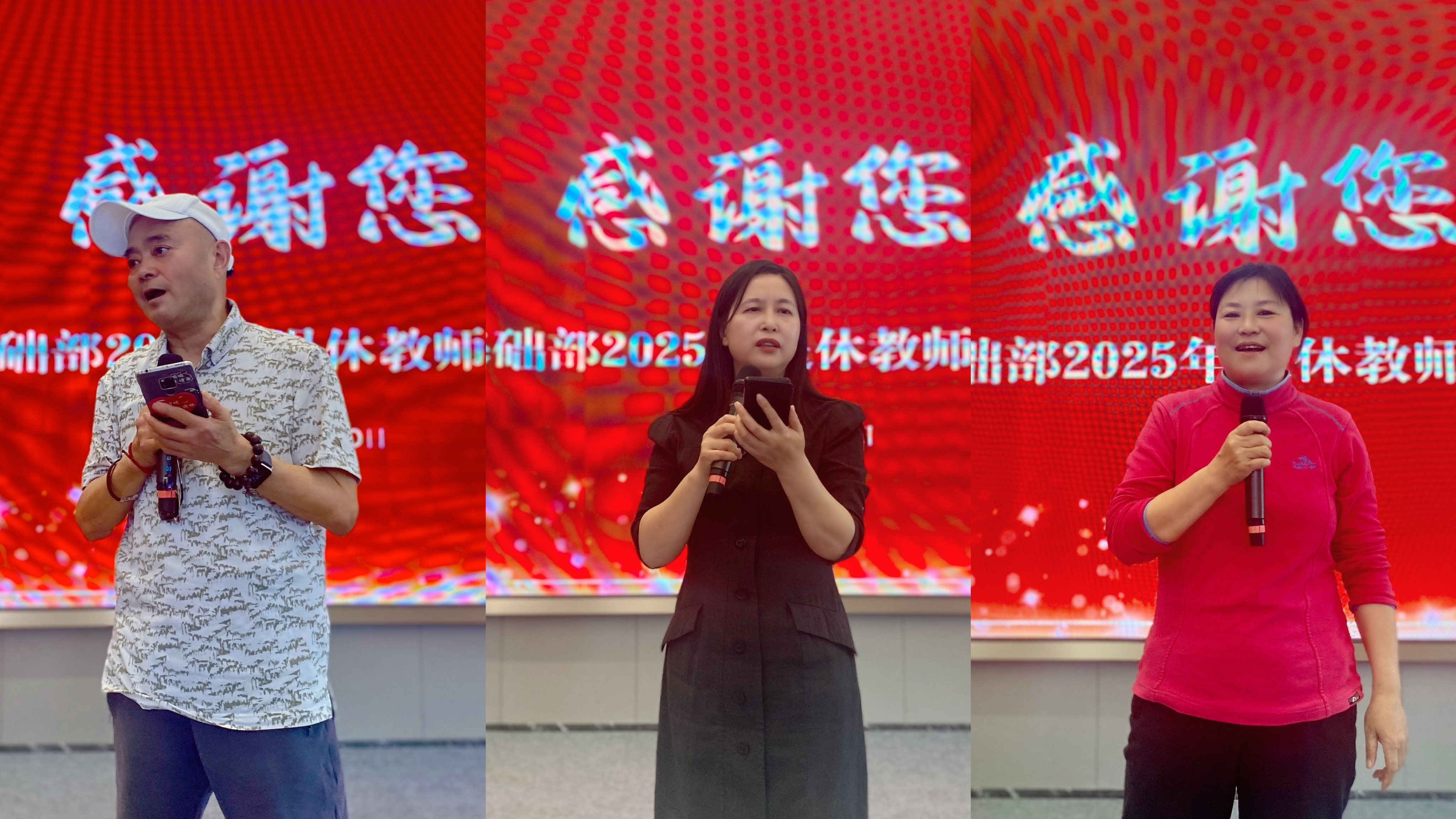 随后,三位荣休教师依次上台,结合自己的教学生涯,分享了在教育道路上的感悟与收获。吴志全老师回忆起自己初登讲台时的紧张与兴奋,感慨多年来学生们的成长与进步是他最大的动力;吴雅老师则讲述了自己与学生之间的温暖故事,那些一起奋斗、一起欢笑的日子,成为她教学生涯中最宝贵的财富;钟于老师表达了对学校深深的眷恋之情,她感谢学校提供的平台,让自己能够实现教育理想。“教育是一场温暖的遇见,也是一场漫长的修行。”他们的发言情真意切,引发了在场教师的强烈共鸣。