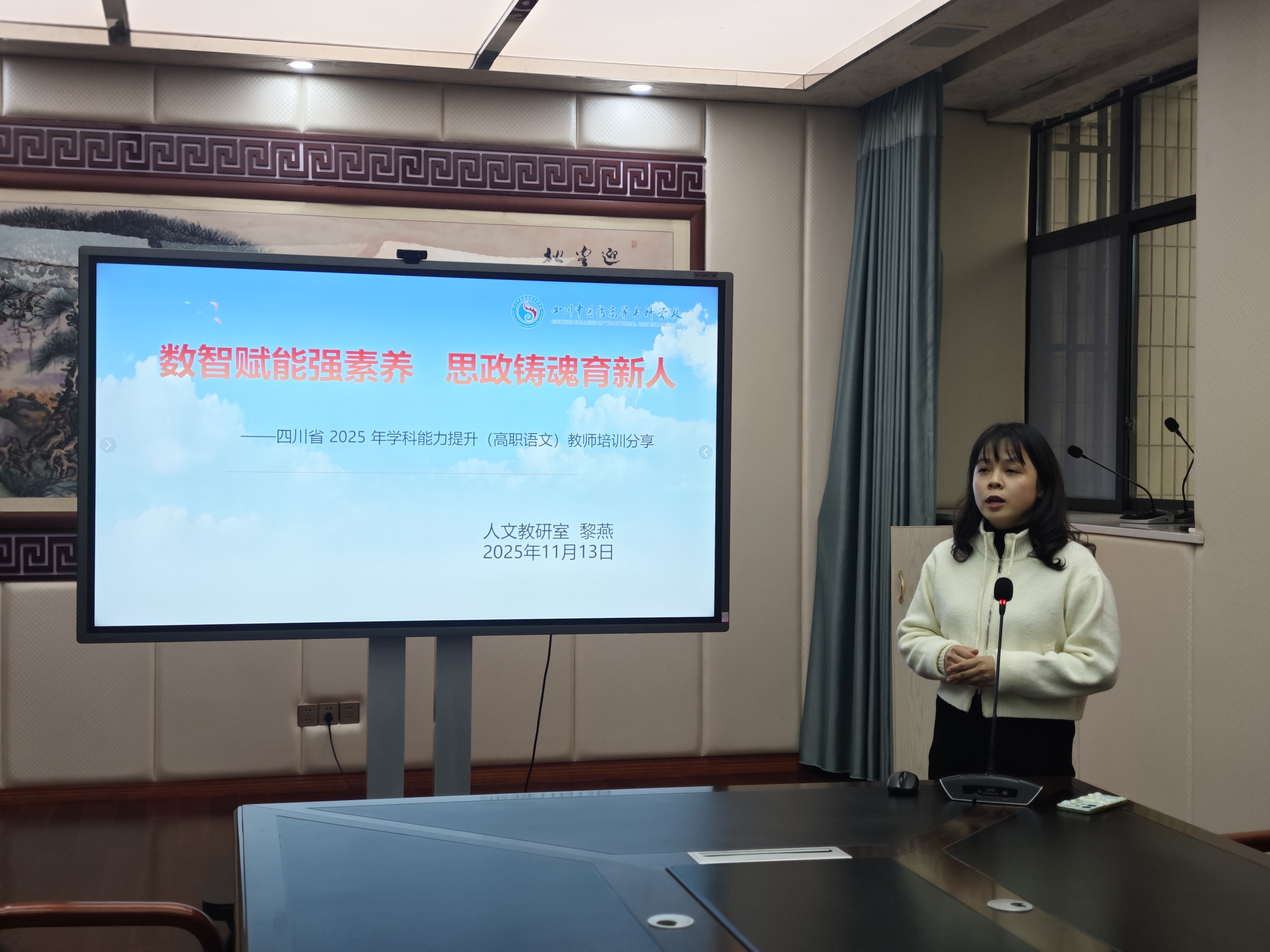为筑牢师资队伍建设根基,持续提升教师科教创新能力与综合育人素养,11 月 13 日下午,公共基础部成功举办第十期教师科教创新能力提升专题培训。本次培训特邀部门文学硕士、副教授黎燕担任主讲,以《数智赋能强素养 思政铸魂育新人 —— 四川省 2025 年学科能力提升(高职语文)教师培训分享》为题,带来了一场兼具理论深度与实践价值的精彩讲座。